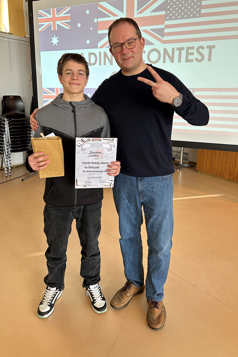 Mit Stolz dürfen wir mitteilen, dass einer unserer Schüler wieder einmal zu den Landkreissiegern beim Englischvorlesewettbewerb gehört. Bogdan aus der Klasse 8cM setzte sich beim English Reading Contest in Münchberg gegen die Sieger verschiedener Schulen aus dem Schulamtsbezirk Hof durch und konnte so den 2. Platz erreichen. Es musste jeweils ein unbekannter und ein bekannter Text möglichst richtig und betont auf Englisch vorgelesen werden.