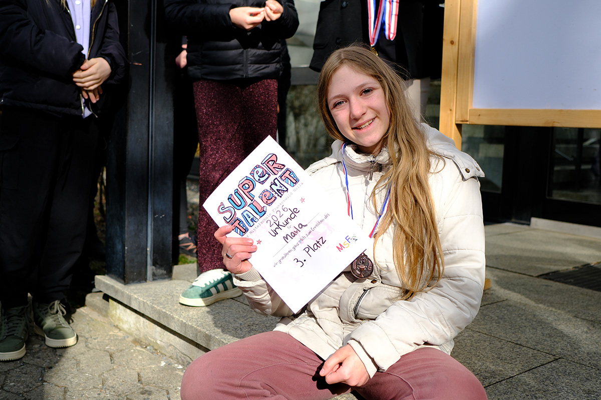 An unserer Mittelschule Frankenwald konnte die Jury unter der Leitung von Frau Edling in der Vorrunde die verschiedensten Talente entdecken, von Keyboardspielen bis Ohren einklappen, von Gesang bis zu Dance-Acts. In dieser vielfältigen Runde qualifizierten sich Lyza aus der 8a, sowie Amelie und Marla aus der 6aG für das Finale. Hier konnte sich schließlich Lyza mit einem Punkt Vorsprung auf Amelie durchsetzen, Marla lag auch nur knapp dahinter.