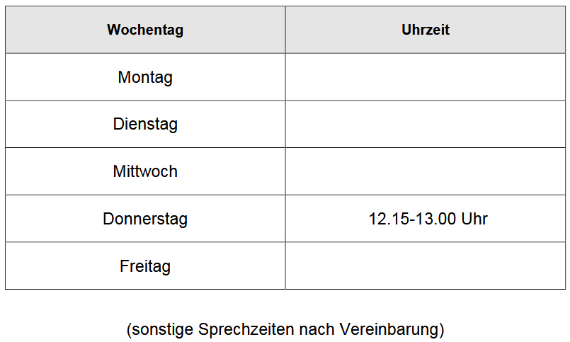 (Außerhalb der Sprechzeiten bitte Kontakt per E-Mail Kontakt aufneh-men)
